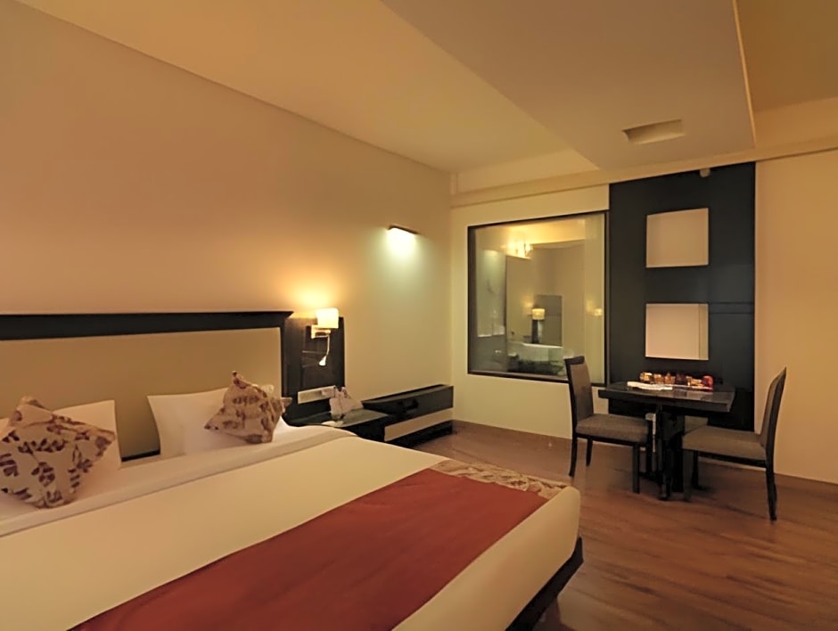 Spacious room features a bathroom with a view into the room, a bathtub and separate shower area.